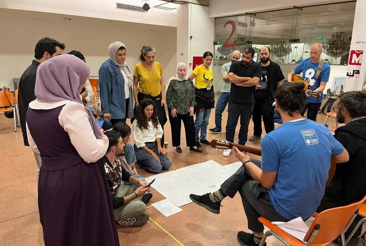 In early November, we organised a training week in Amman, Jordan carried out by Sounds of Change trainers Sander van Goor, Nour Hanna, and Atef Malhas, along with trauma expert Maartje Schel from Trauma International. They guided a lively and diverse group through a week packed with practical knowledge about trauma. They also covered a range of musical and creative intervention techniques that create safe spaces, bring joy, connection, and help reduce stress and trauma. Participants came from eight different partner organisations, ranging from youth workers, music teachers, clowns, and therapists. Each brought their own unique perspective, energy, and experience to the training process.